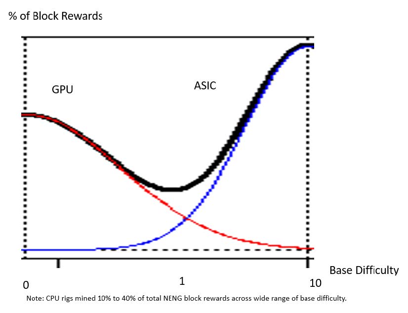 When base diff rise to 1 or above because of huge GPU mining rigs mining NENG, ASIC rigs will dominate NENG mining again as the found blocks are outside the 3 seconds spike diff region. In the right side of graph 1, GPU gradually lost dominance and ASIC will recover its dominance on NENG again.